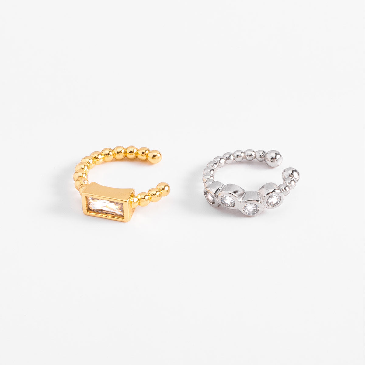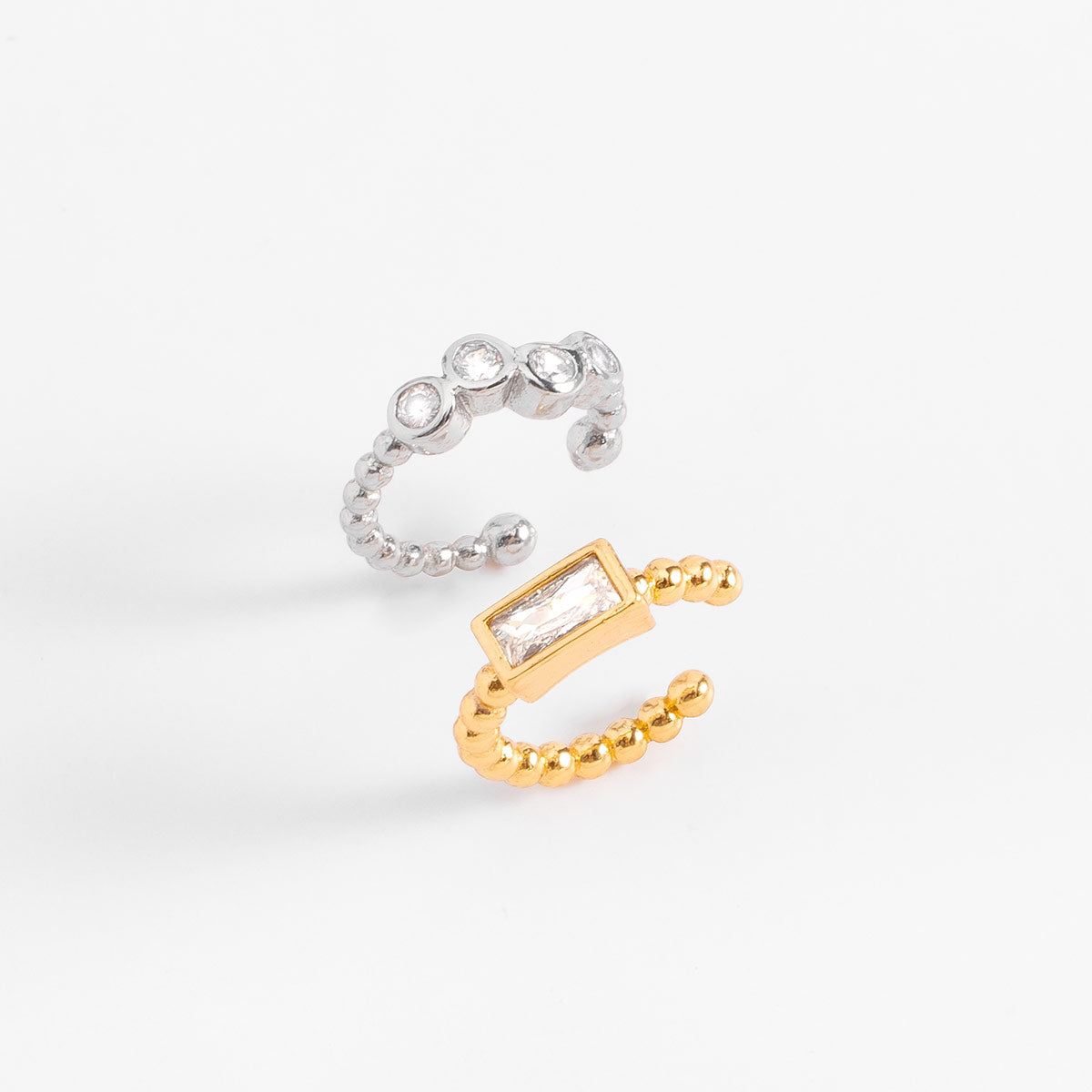 Estos aretes en baño bitono destacan por su combinación contemporánea de metales y piedras en tono cristal, aportando un toque brillante y originalidad. Son perfectos para quienes buscan piezas modernas con personalidad, ideales para realzar atuendos casuales o dar dinamismo a looks de noche.